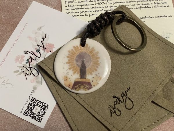 Puedes adquirirla en lámina de cartonaje de alto gramaje en tamaño A4 ó A5; en medalla de cerámica para el cuello con cordón de 40cm de hilo de seda japonesa bañado en oro de 18kt y clip de hebilla de semilla de melón ó, si no, goma elástica ajustable (color rosa, granate, azul, azul oscuro, verde o beige); también se puede adquirir como medalla de cerámica de cuna o adorno de hogar en tamaño 5cm (circular lisa) u 8cm (circular con ondas), acompañado por un lazo cuya referencia deberás indicar al finalizar el pedido.