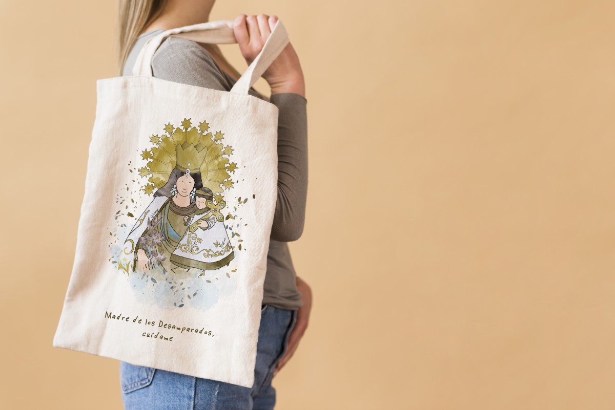 más gastos de envíoTote Bag con ilustración de @isar.gu para que siempre te acompañe la devoción a María que tanto te ha ayudado hasta ahora. Los santos también son parte de nuestra vida y ruegan por nosotros. ¡No pierdas la oportunidad de que te sigan allá donde vayas!