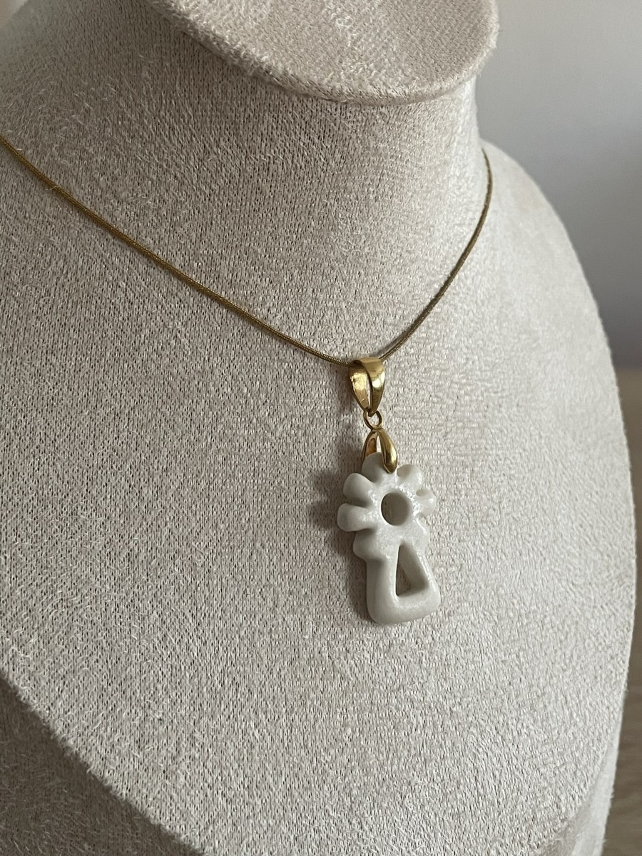La pieza central representa la silueta de la Virgen del Pilar, modelada con mimo en cerámica de alta calidad y cocida en horno a altas temperaturas. Este proceso artesanal asegura resistencia y durabilidad, al tiempo que conserva la pureza y la delicadeza de sus formas. La cerámica, con su tacto noble y cálido, convierte a la joya en un objeto que respira autenticidad: sencillo, elegante y cargado de simbolismo.